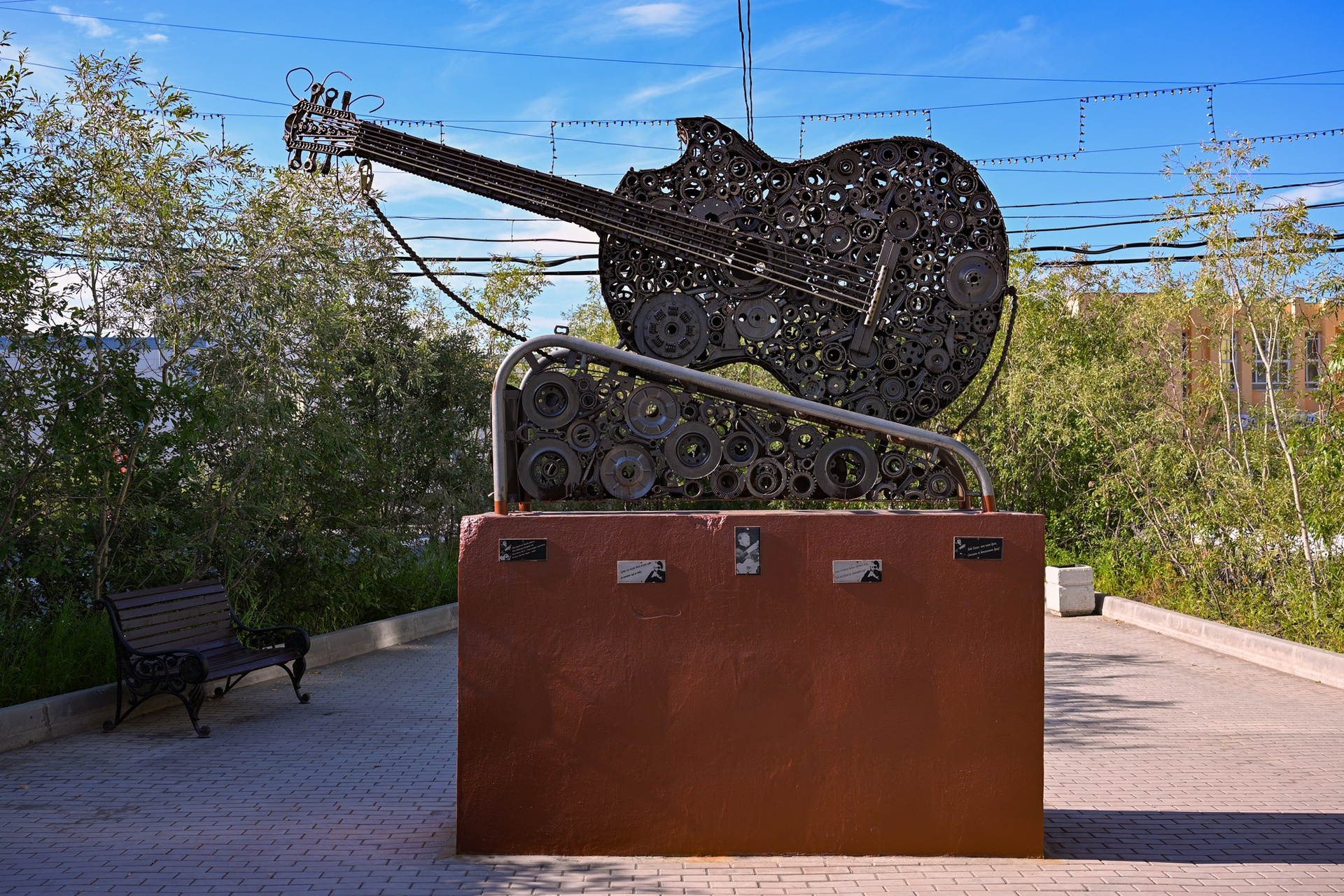 Памятник творчеству В. С. Высоцкого . Стоит гитара в сквере около КДЦ им. Вл. Высоцкого. Арт-объект установили в 2018 году, в канун 65-летия города Норильска. На постаменте размещены таблички с портретами, высказываниями и отрывками из песен поэта.