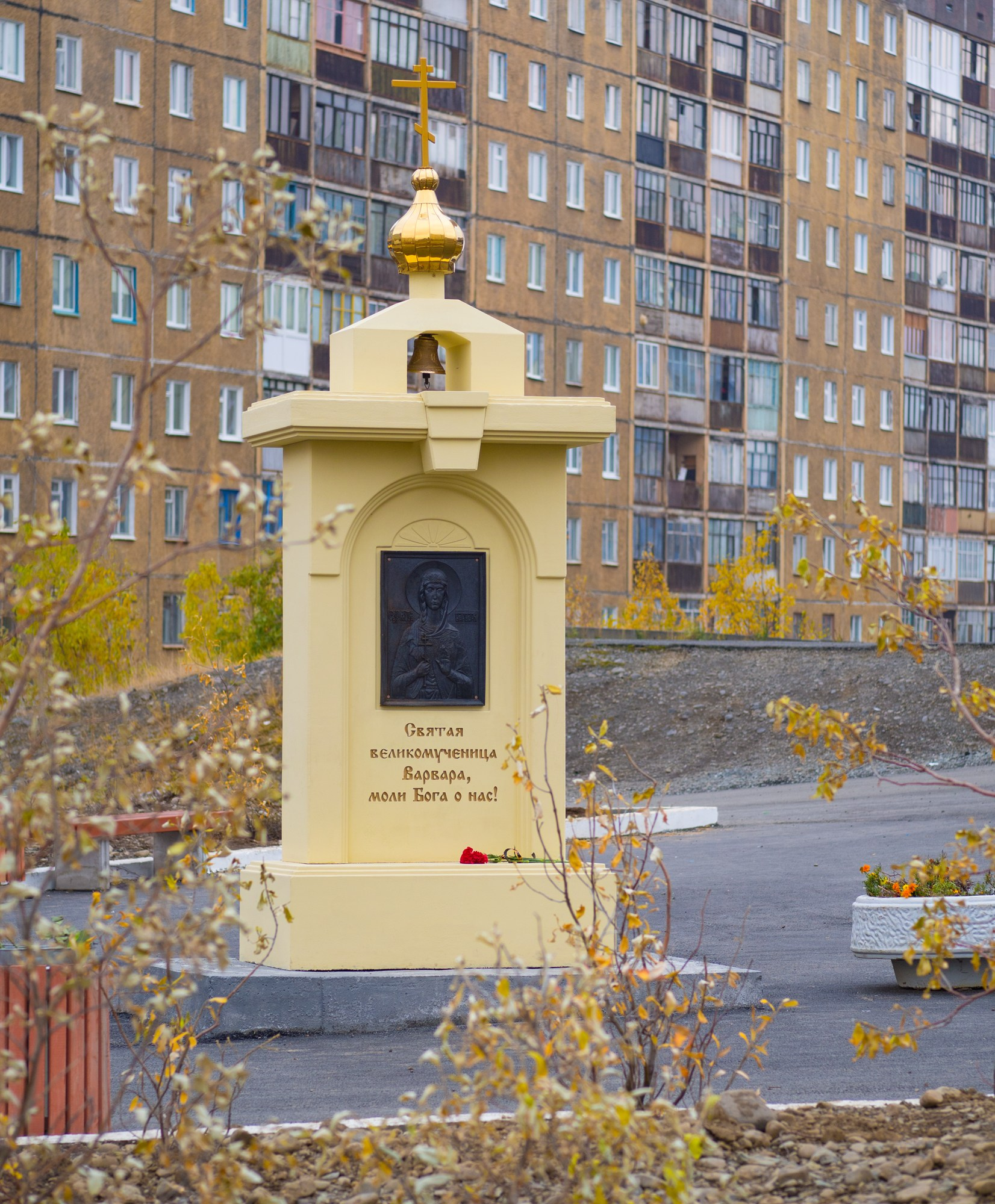 Киот с иконой святой великомученицы Варвары. Она является покровительницей всех трудящихся в земных недрах. Появился в Талнахе 25 августа 2018 года, накануне дня горняка (шахтера).