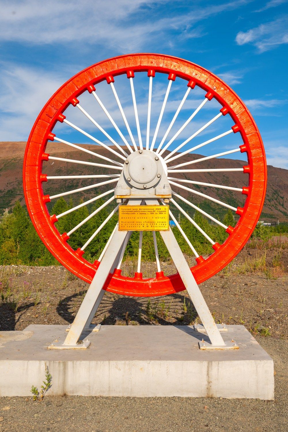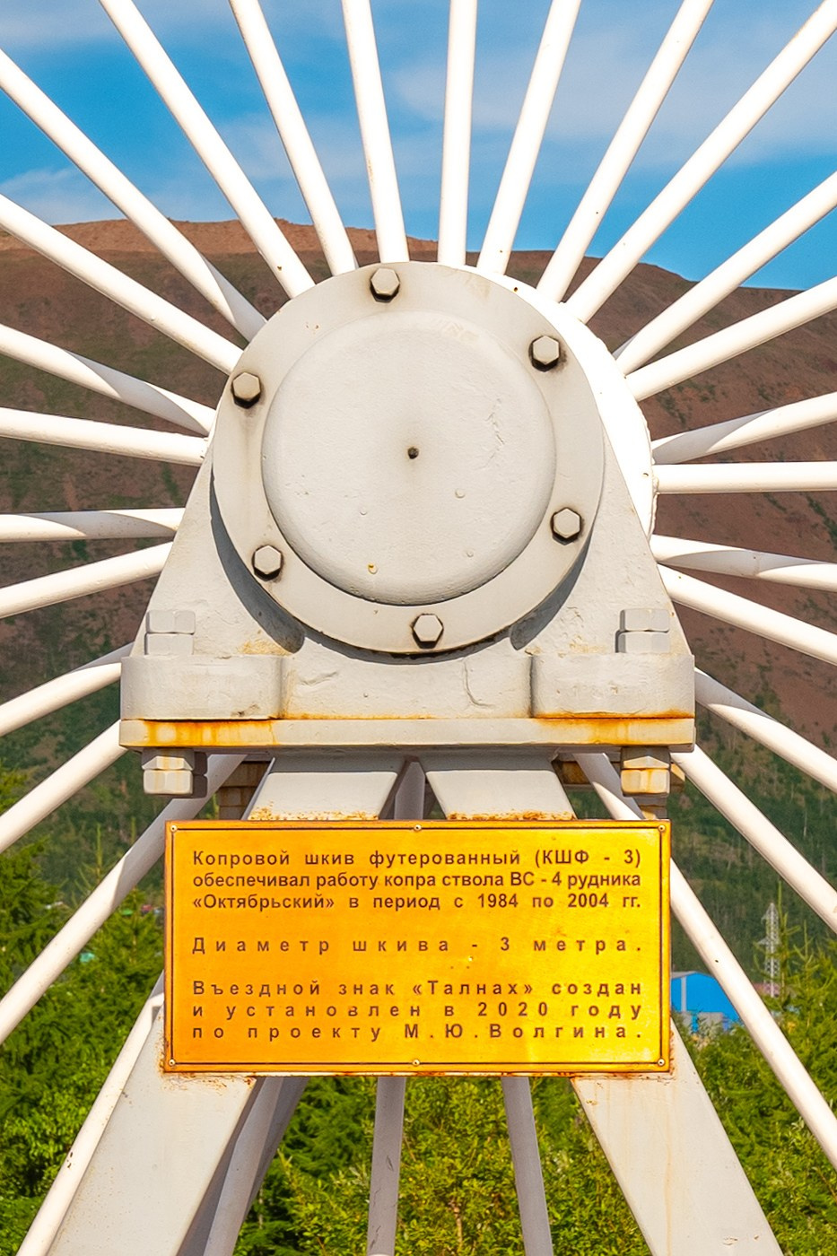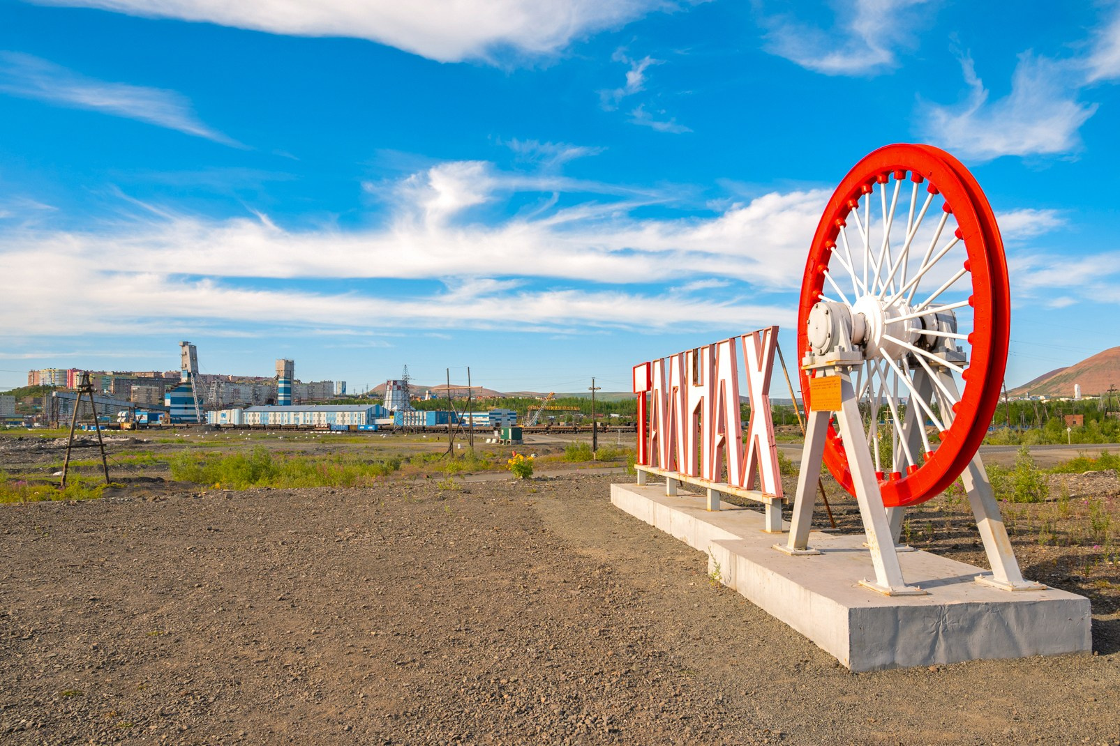 Расположен на объездной дороге рядом с рудником «Маяк». Создан и установлен в 2020 году по проекту М. Ю. Волгина. Большая двухметровая надпись заканчивается копровым шкивом с рудника «Октябрьский»